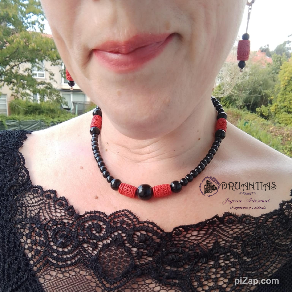 El azabache en bola de distintos tamaños la hacen una PIEZA única y sus entrepiezas de barriles de coral rojo labrado, además de lucir un complemento único también tendrás la oportunidad de lucir dos piedras preciosas espectaculares.